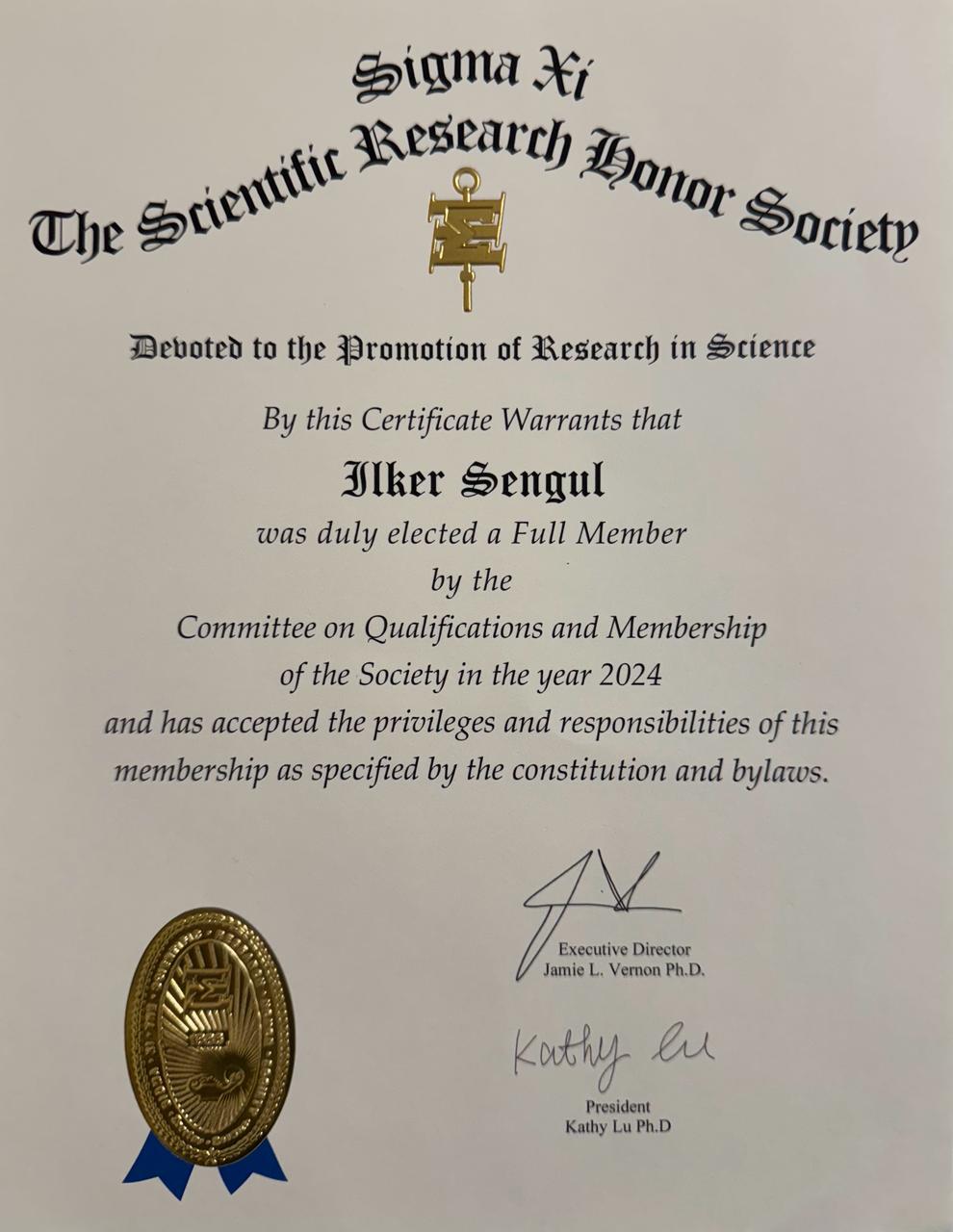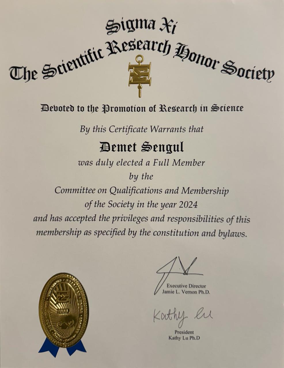 1886 yılında kurulan ve üyeleri arasında 200’ün üzerinde Nobel Ödüllü bilim insanını barındıran Sigma Xi, bilimsel araştırmalara katkı sunan seçkin akademisyenleri onurlandırmak amacıyla faaliyet gösteriyor. Prof. Dr. İlker Şengül ve Doç. Dr. Demet Şengül, bilimsel araştırmaları, akademik başarıları ve uluslararası düzeydeki katkıları nedeniyle Sigma Xi tarafından üyelik sertifikası ile ödüllendirildiler.