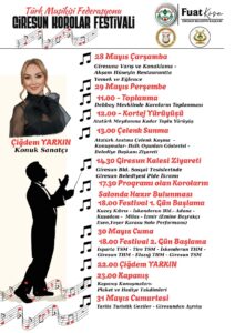 Festivalin Giresun Musiki Cemiyeti, Adana Öğretmenler Korosu Derneği, Elazığ Kültür ve Musiki Derneği, Isparta Musiki Derneği, İskenderun Belediyesi Musiki Derneği, İskenderun Sanat ve Musiki Derneği, İzmir Türk Musiki Derneği, İzmir Sanat ve Musiki Derneği, KKTC Müzik Gönüllüleri Derneği, Kuşadası Türk Müsikisi Kültür ve Sanat Derneği, Milas Musiki Derneği ve Tire Müzik Dostları Derneğinin katılımıyla yapılacağını belirten Seher Ataün ve Muammer Usta program akışı ile ilgili de şu bilgileri verdiler:” Giresun Belediyesi Kültür ve Sanat Merkezi’nde yapılacak festivalimiz 29 Mayıs günü saat 12.00′ de Depboy mevkinden Atatürk Meydanı’ na kadar yapılacak kortej yürüyüşü ile start alacak.Burada halk oyunları gösterisi sunulacak ve ardından Belediye Başkanımız Sayın Fuat Köse ziyaret edilecek.Akşam saat 18.00′ de ise konuk musiki derneklerimizin bir bölümü sahne alarak müzikseverlerle buluşacak.30 Mayıs Cuma günü yine saat 18.00′ de musiki derneklerinin bir bölümü daha sahne alacak.