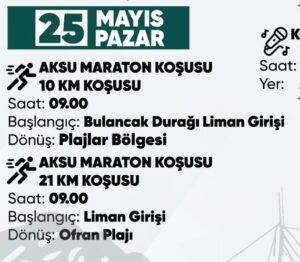 Aksu Maraton Koşusu (10 Km. Liman Girişi – Plajlar Bölgesi arası 09.00), Aksu Maraton Koşusu (21 Km. Liman Girişi – Ofran Plajı arası 09.00)