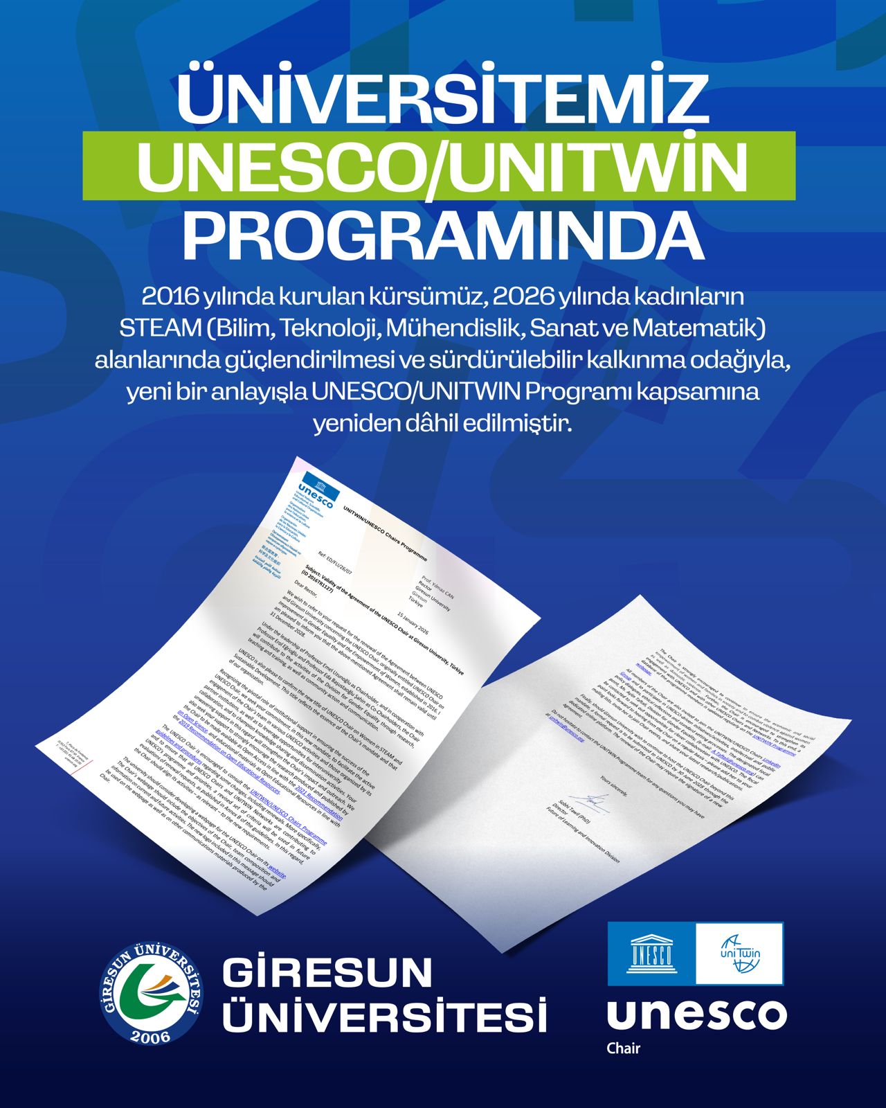 Üniversitemiz bünyesinde faaliyet gösteren Birleşmiş Milletler UNESCO / UNITWIN Kürsümüzün üyeliği, Birleşmiş Milletler Eğitim, Bilim ve Kültür Örgütü (UNESCO) tarafından alınan kararla 31 Aralık 2028 tarihine kadar yenilenmiştir.