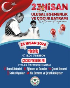 23 Nisan’da hep birlikte yürüyor, hep birlikte eğleniyoruz 23 Nisan Ulusal Egemenlik ve Çocuk Bayramımız için yine eğlenceli bir program hazırladık. Geleceğimizin teminatı çocuklarımızla el ele veriyor, birlikte yürüyor ve birlikte eğleniyoruz. 23 Nisan 2026, Perşembe 13.00 – Debboy’dan yürüyüş 14.00 – Atatürk Meydanı’nda etkinlikler Tüm halkımız ve çocuklarımız, Dans gösterilerine Çocuk konserine Yüz boyamaya Atölyelere Sokak oyunları ve daha fazlasına davetlidir. Herkesi bu coşkuya davet ediyorum. 🇹🇷